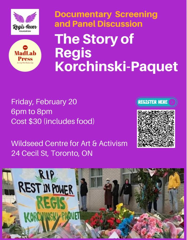 The Story of Regis Korchinski-Paquet Documentary Screening & Panel Discussion Date: Friday, February 20, 2026 Time: 6:00 PM to 8:00 PM (doors open at 5:30) Location: Wildseed Centre for Arts and Activism (Multipurpose room) – 24 Cecil St, Toronto, Ontario